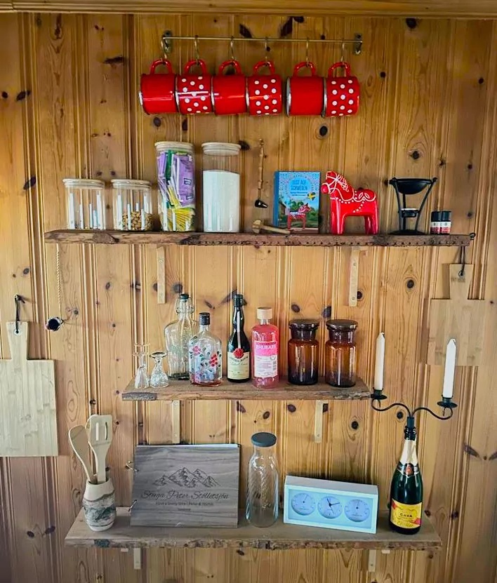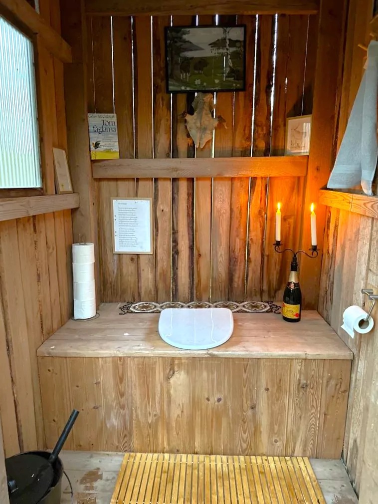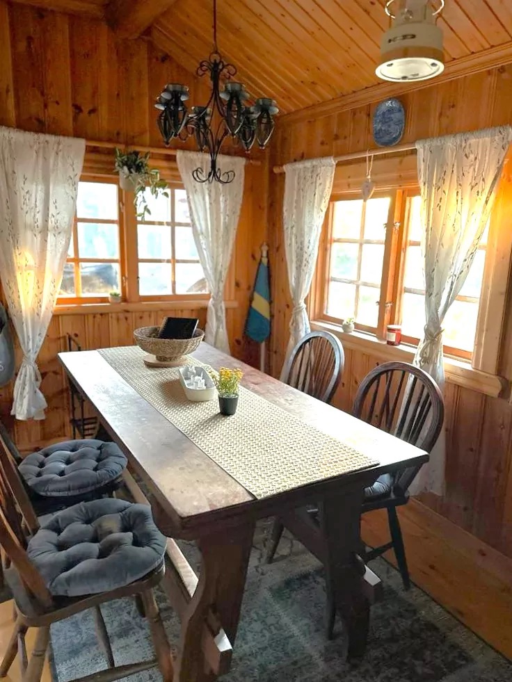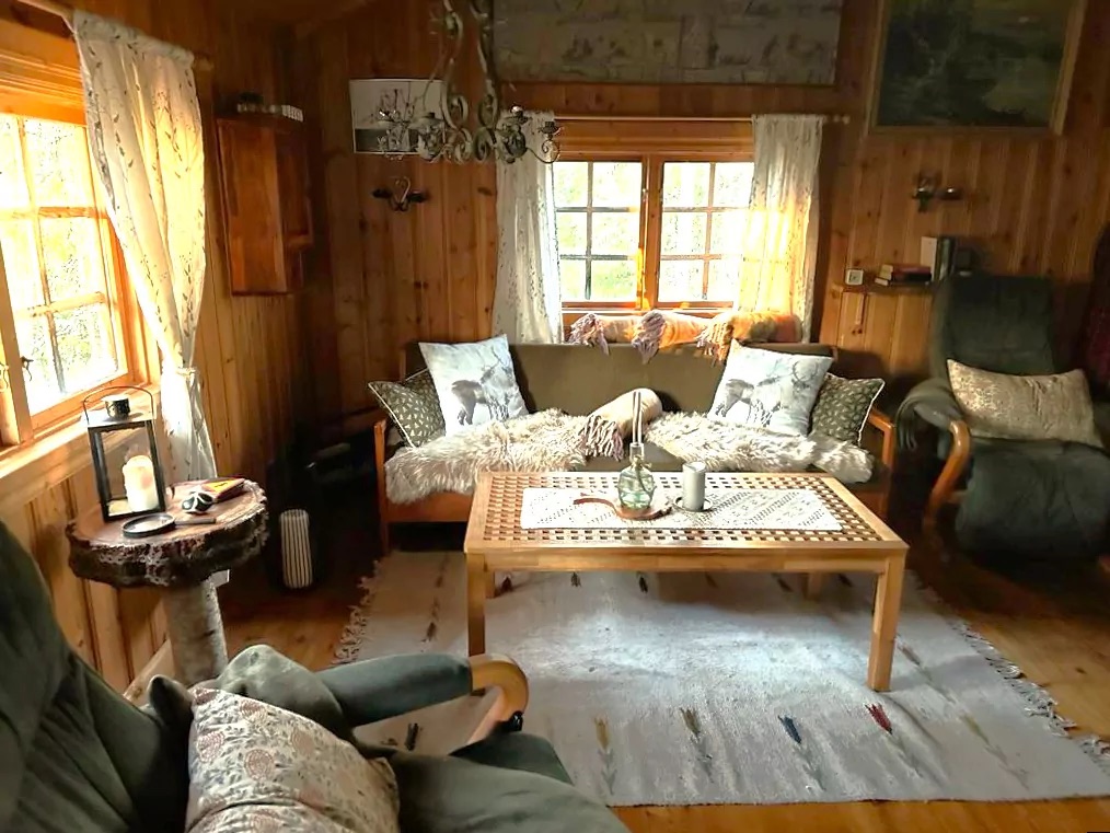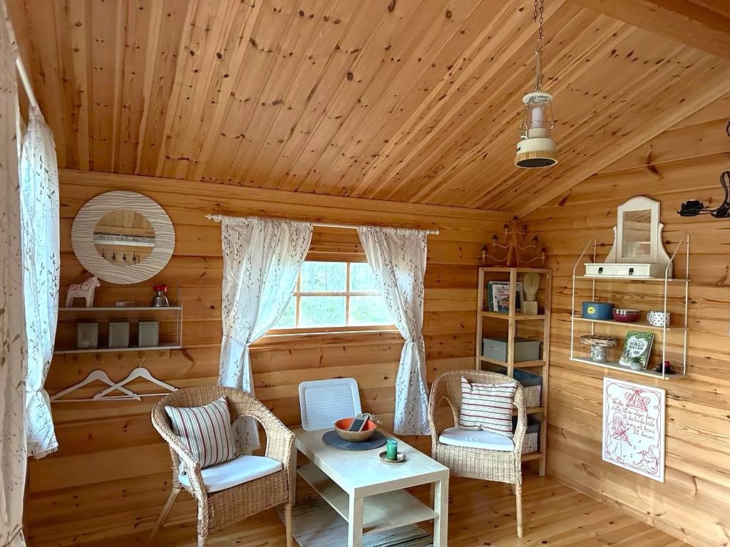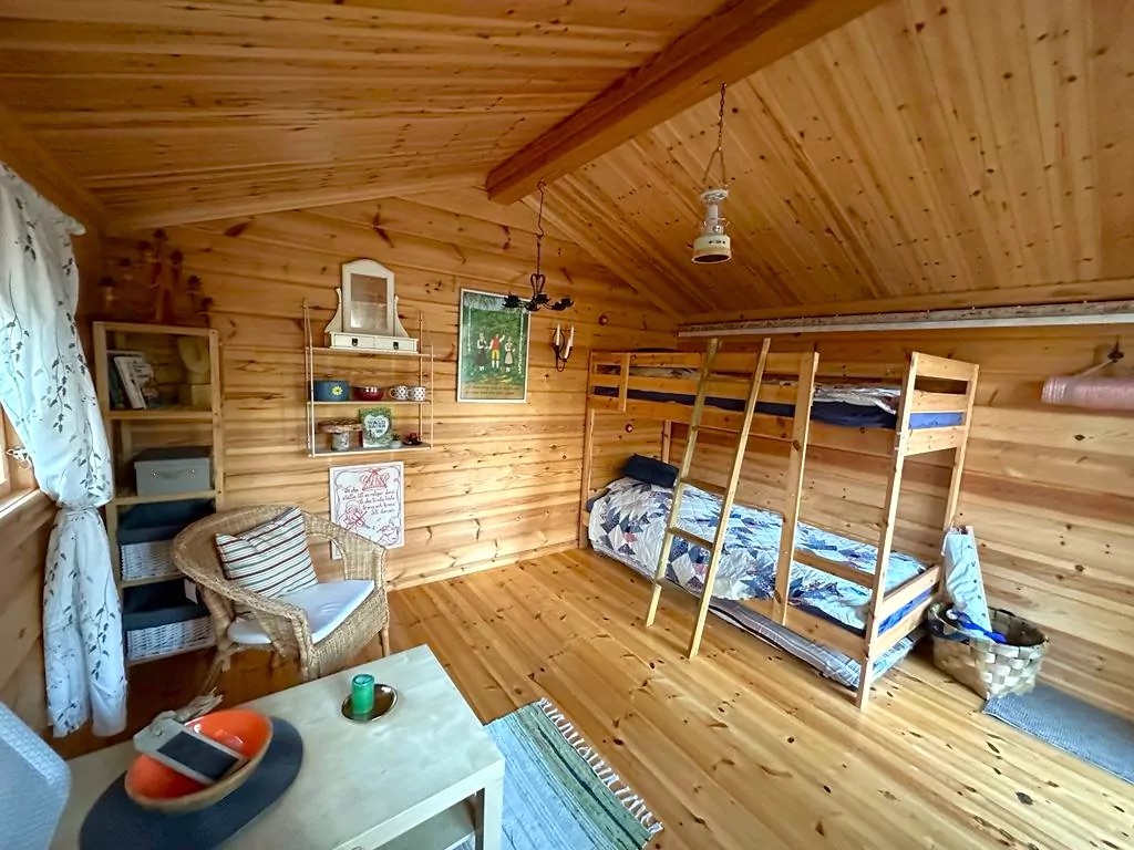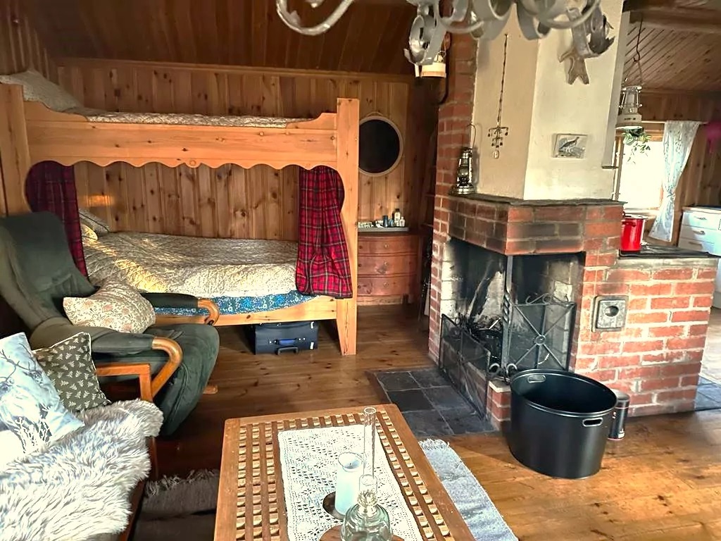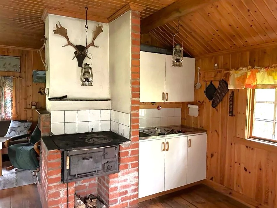 This charming and simply furnished cabin provides the basis for unforgettable nature experiences and the opportunity to nurture the innate human connection to nature. Here, you can become one with nature and live as our ancestors did. The clear water comes from the lake, cooking is done on a wood stove or over an open fire. There is no electricity, but a small solar panel is available to charge power banks and devices on sunny days. The only sources of light are battery-powered lamps and candles. The toilet is a simple outhouse with a composting toilet located outside the cabin. For showering and washing, an outdoor solar shower can be used.