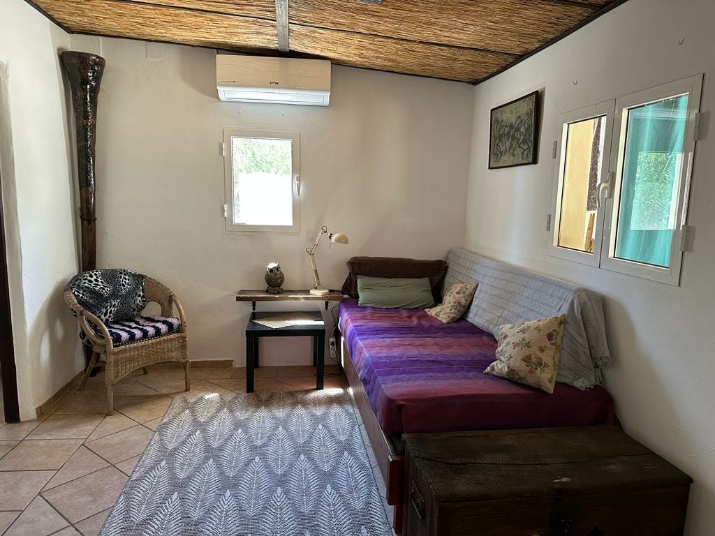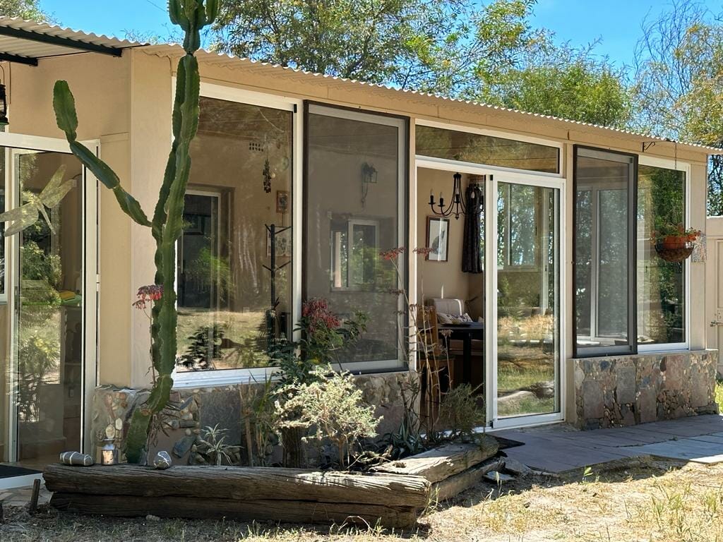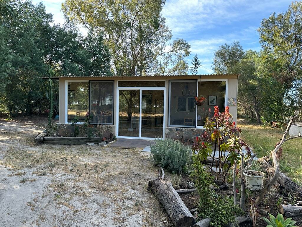 The guesthouse features 2 bedrooms (1 double bed/2 single beds), a bathroom with a shower, sink, and toilet, a living room with a kitchen area, and a glass-enclosed terrace with a kitchen.
